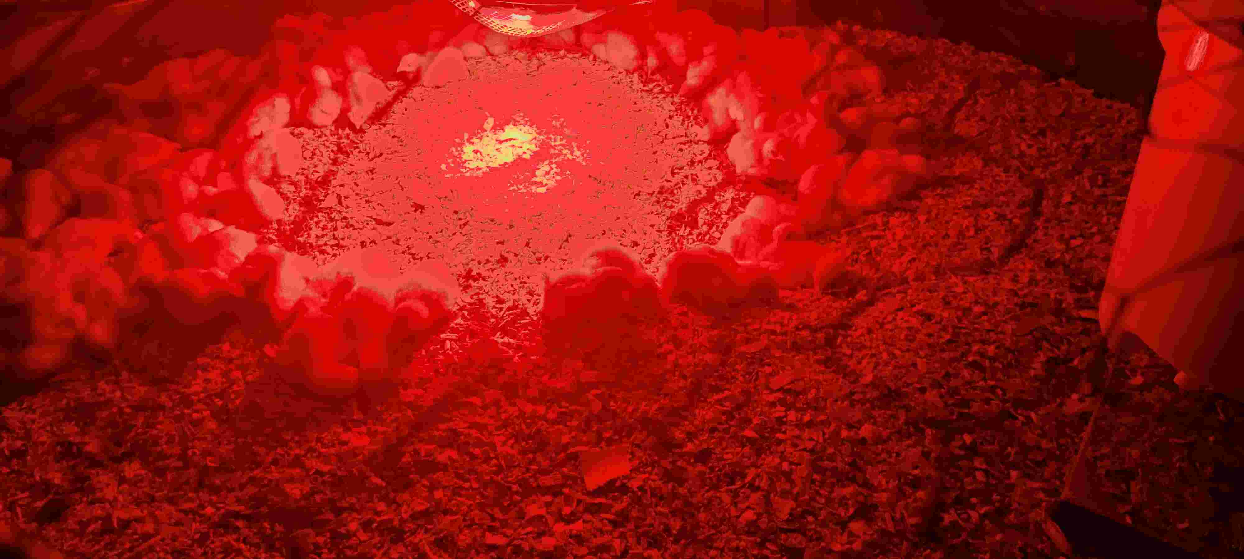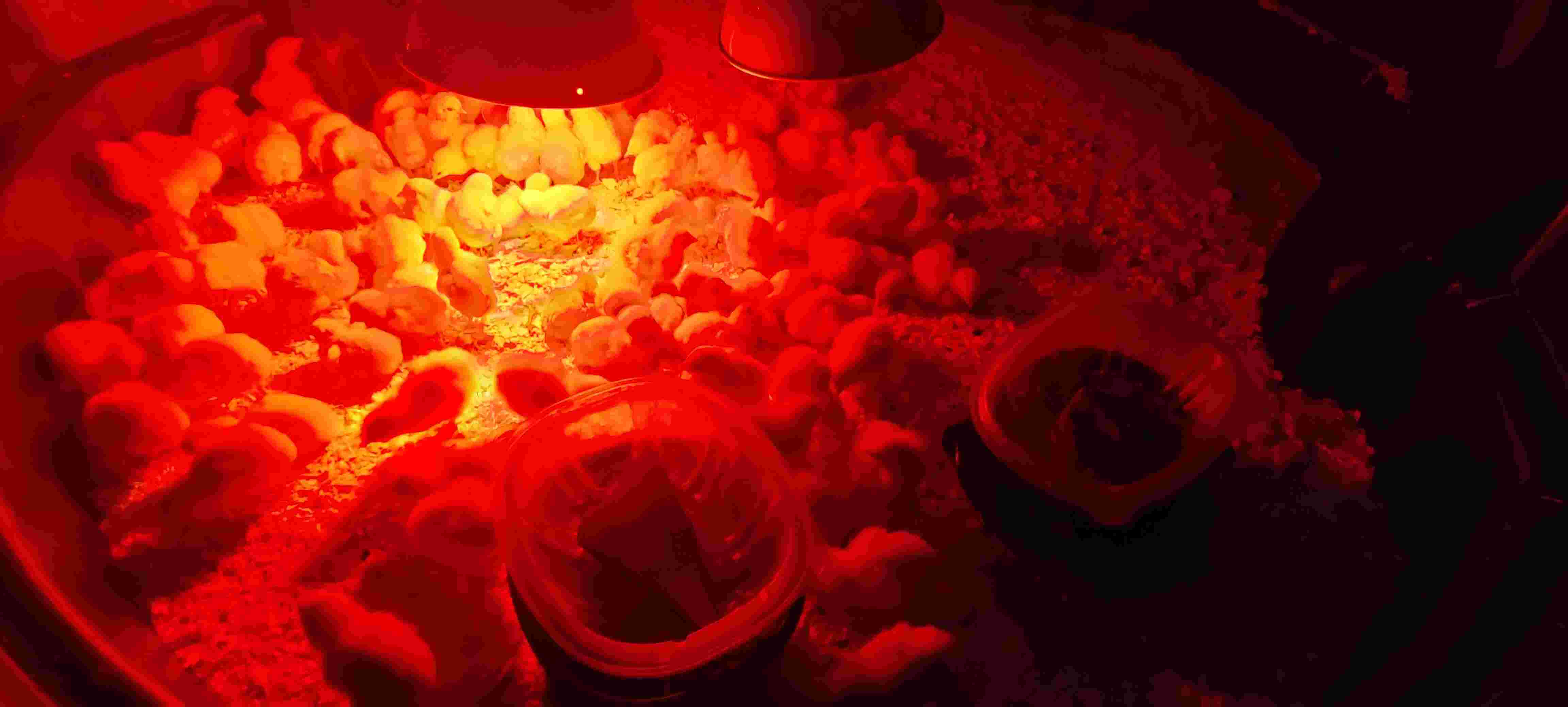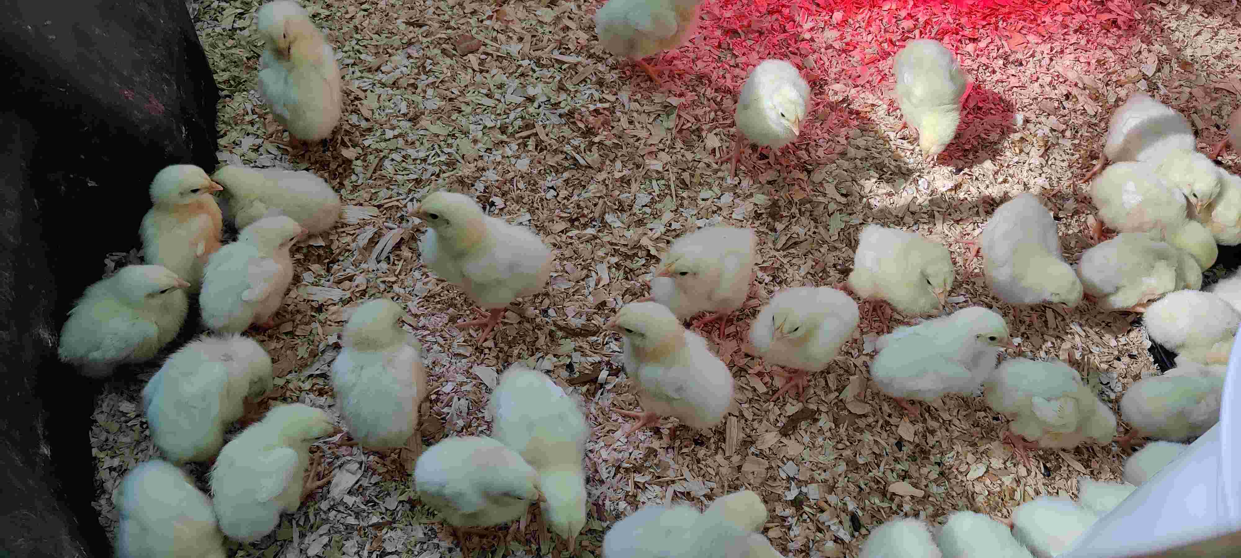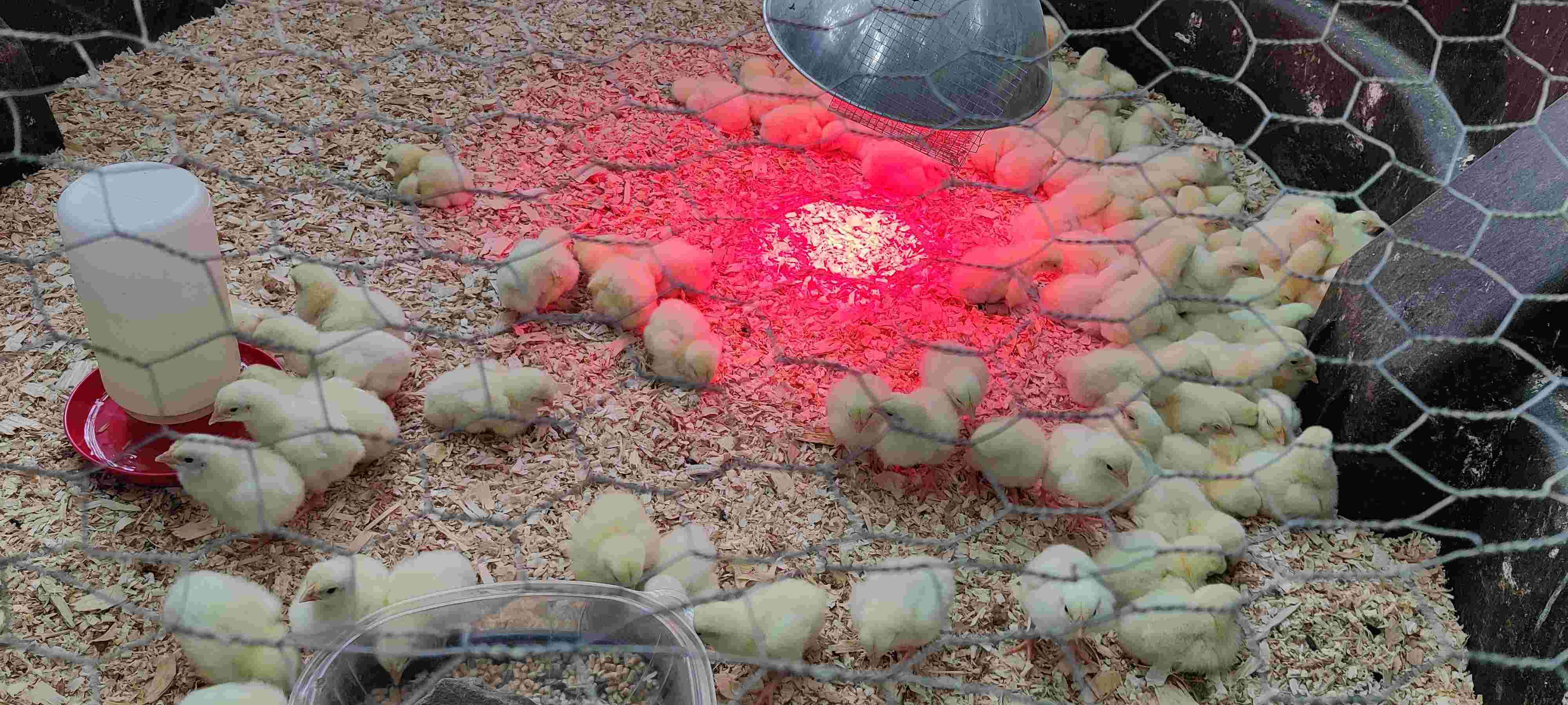 COMMENTS: 100 CHICKS ARRIVED IN THE MAIL TODAY. YOU HAVE TO PICK UP LIVE CHICKS FROM THE CLOSEST POST OFFICE. WHEN I OPENED THE BOX, 15 OUT OF 100 CHICKS DIED DURING SHIPMENT. MEYER HATCHERY REFUNDED THE 15 DEATHS. I USED A 250W RED HEAT LAMP AND A SMALLER BLACK HEAT LAMP IN THE BROODER. I FED THEM SOAKED WILD BIRD SEED COATED IN RAW EGG AND SPRINKLED WITH SAND. CHICKS EAT/SLEEP ALL NIGHT BECAUSE THEY CAN SEE IN THE RED LIGHT FROM THE ONE HEAT LAMP. CHICKS CIRCLE AROUND THE HEAT LAMPS WHICH MINIMIZES SMOTHERING. BROODER FLOOR WAS FILLED WITH FINE PINEWOOD SHAVINGS.