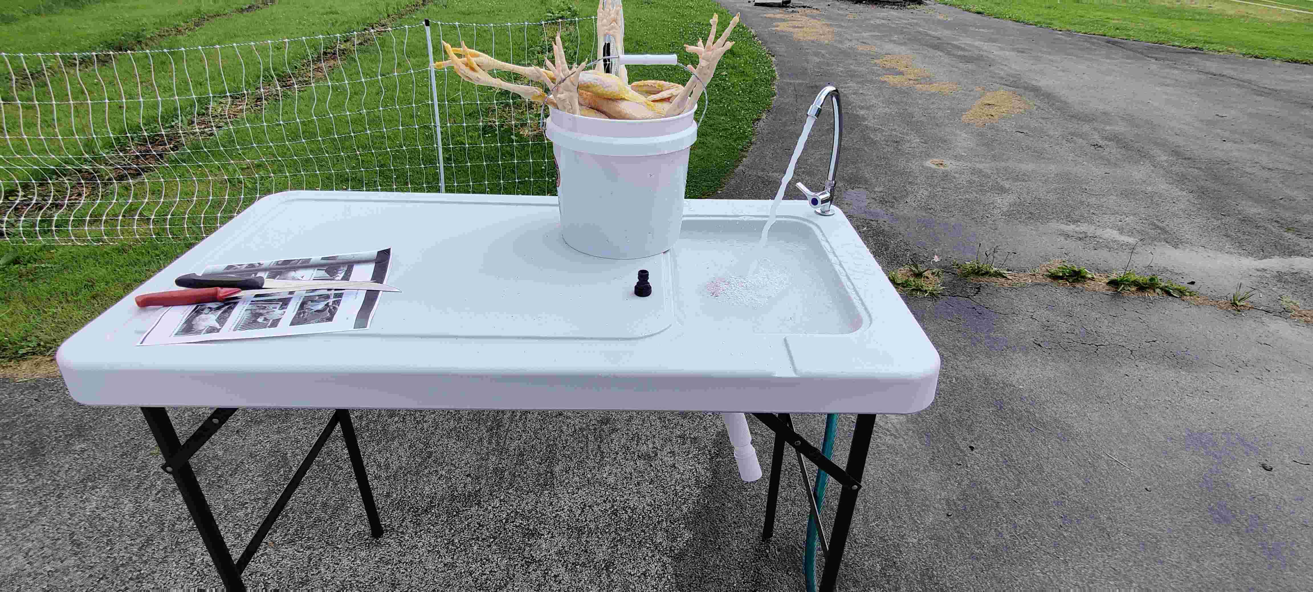 COMMENTS: STARTED SLAUGHTER AT 8:00AM. EARLIER BETTER BECAUSE OF THE HEAT. BECAUSE I WAS DOWN SO MANY BIRDS IN THE PEN, THEY STILL HAD FOOD, WHICH MEANS THEY HAS FOOD IN THEIR THROATS. IT WAS MY MISTAKE, I SHOULD HAVE CUT THEIR FEED APPROPRIATELY. BECAUSE THESE CHICKENS WOULD BE SLAUGHTERED FOR DOGS, I MOVED FORWARD WITH THE SLAUGHTER. I FINISHED 25 CHICKENS TODAY. I REALIZED CHICKENS MUST GO FROM THE SCALDER TO THE PLUCKER IMMEDIATELY OR THE FEATHERS BECOME DIFFICULT TO REMOVE AGAIN IF THE CHICKEN SKIN COOLS OFF. I AM DONE PROCESSING MY FIRST ROUND OF MEAT CHICKENS.