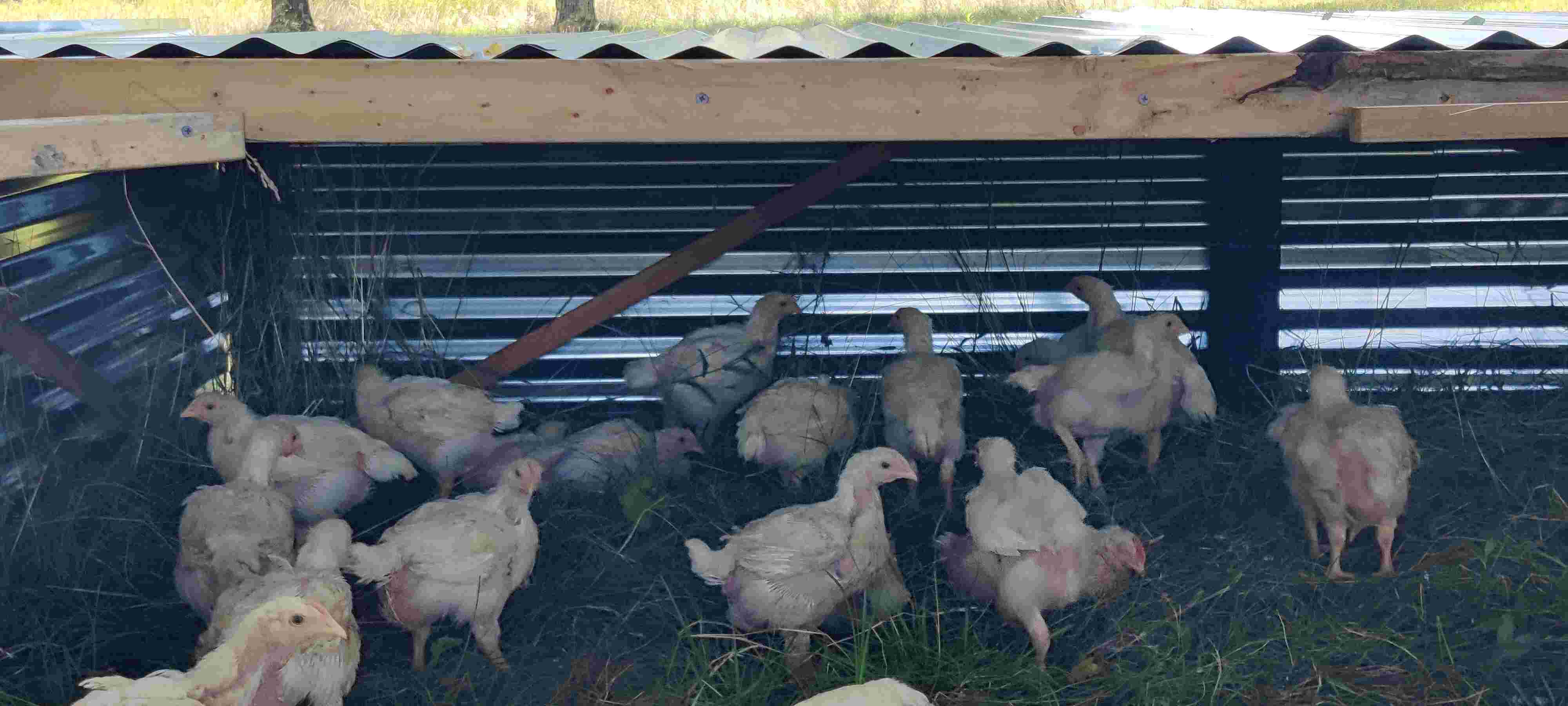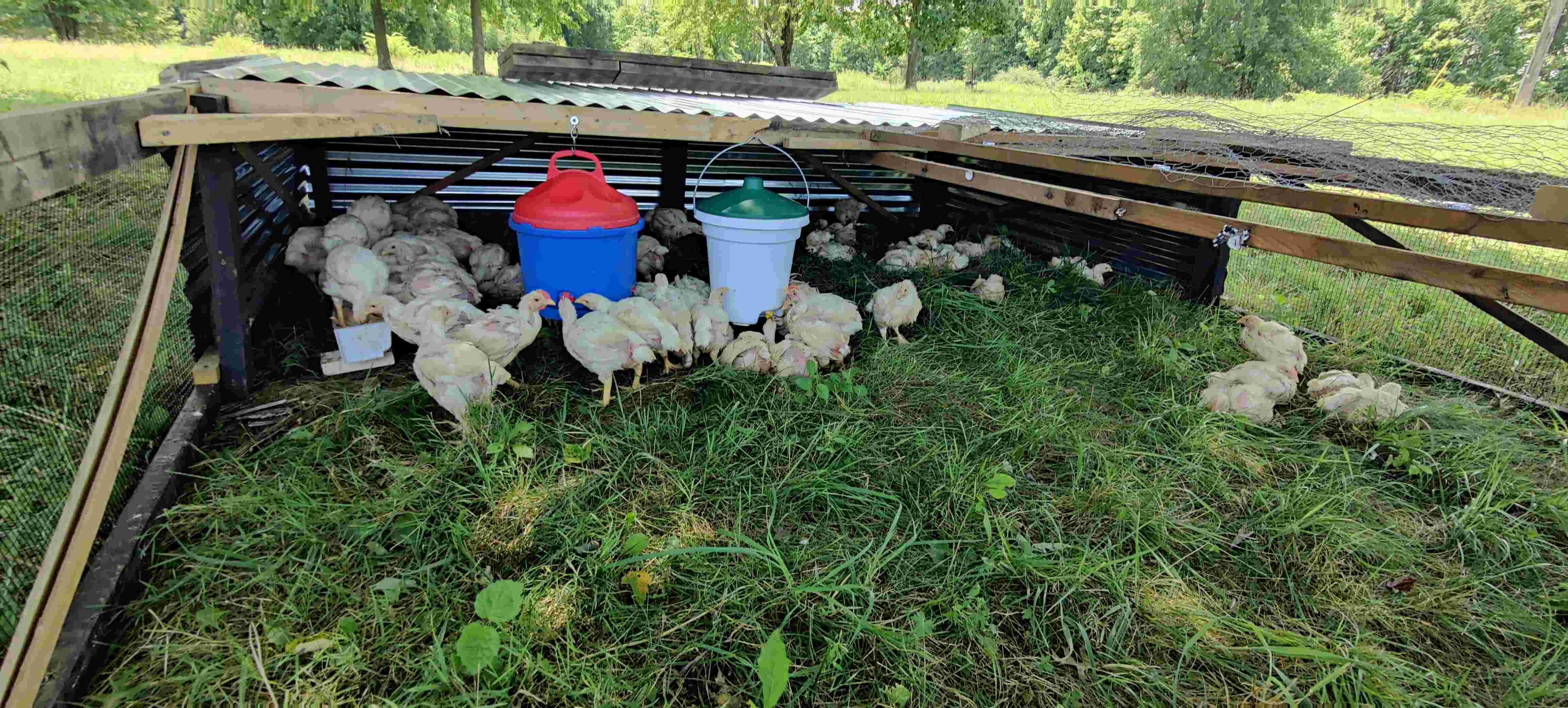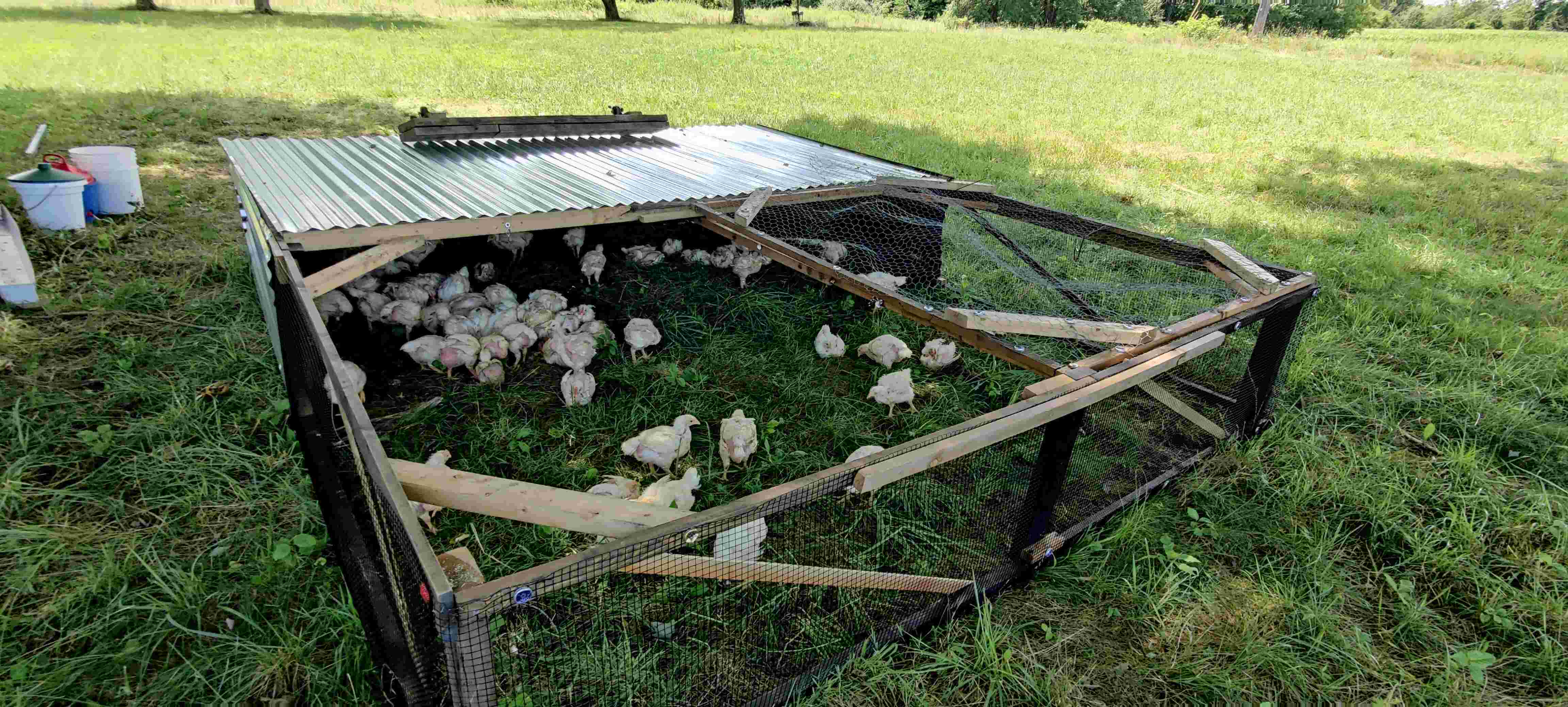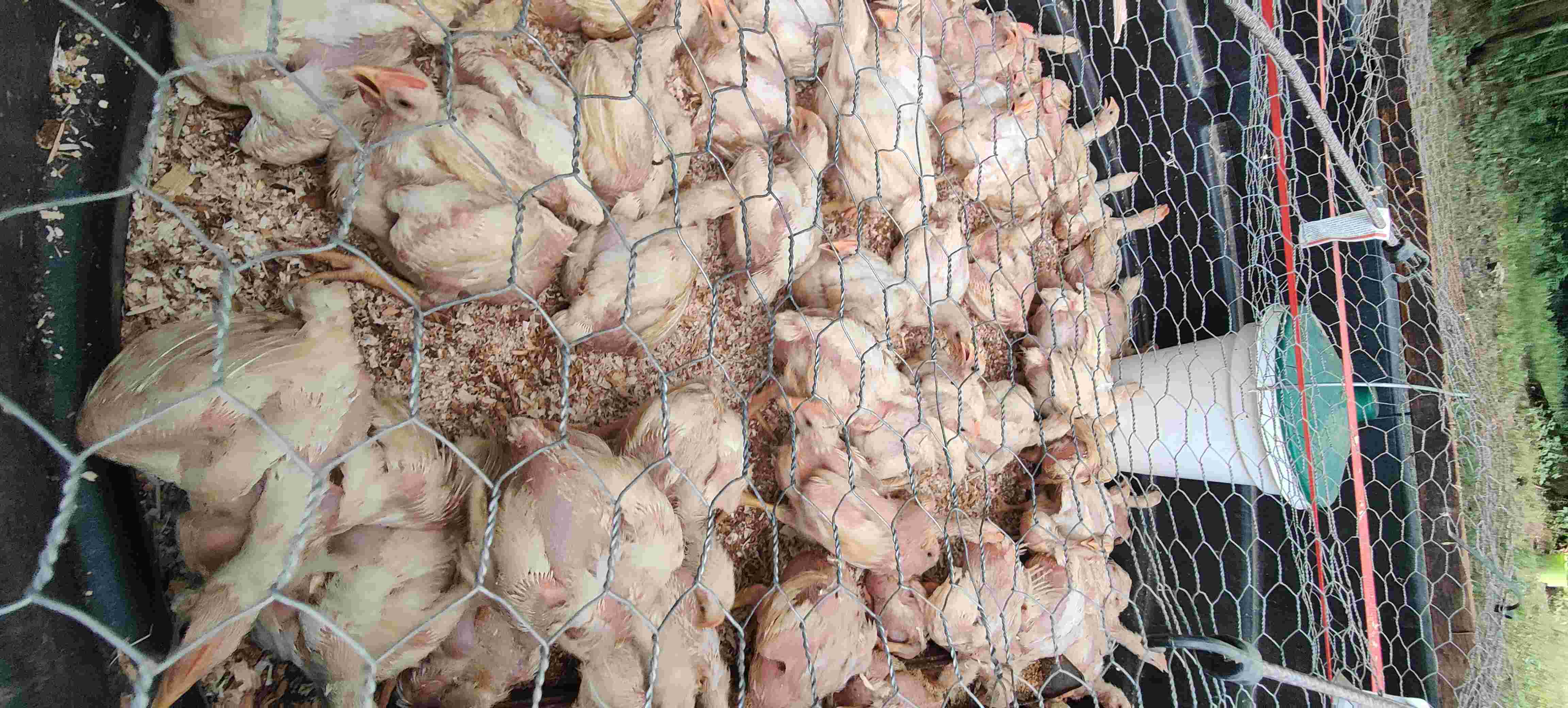 COMMENTS: FOUND ONE OF THE ROOF PANELS RIPPED AWAY FROM THE SCREW AS I WAS PULLING TO MOVE IT. FUTURE PENS NEED THE ROOF TO BE MORE SECURELY SCREWED DOWN. CHICKS IN BROODER ARE EATING 1.5LBS OF FEED PER DAY. MY MIX IS 1 PART SOYBEAN MEAL, 2 PART MILLED CORN, ADD OYSTER SHELLS ANGD GRIT OVER THE TOP. ADD WATER TO REDUCE DUST. THE CHICKS ARE DRINKING MEYER MEATBIRD VITAMIN PACKS EVERY DAY IN THEIR WATER. Ingredients Vital Pack Plus (meat birds): Alpha Tocopheryl Acetate (source of Vitamin E), Vitamin A Supplement, Ascorbic Acid, d-Calcium Pantotenate, Menadione Sodium Bisufite Complex (source of Vitamin K), d-Activated Animal Sterol (source of Vitamin D3), Riboflavin Supplement, Thiamine Hydrochloride, Folic Acid and Biotin Supplement.
