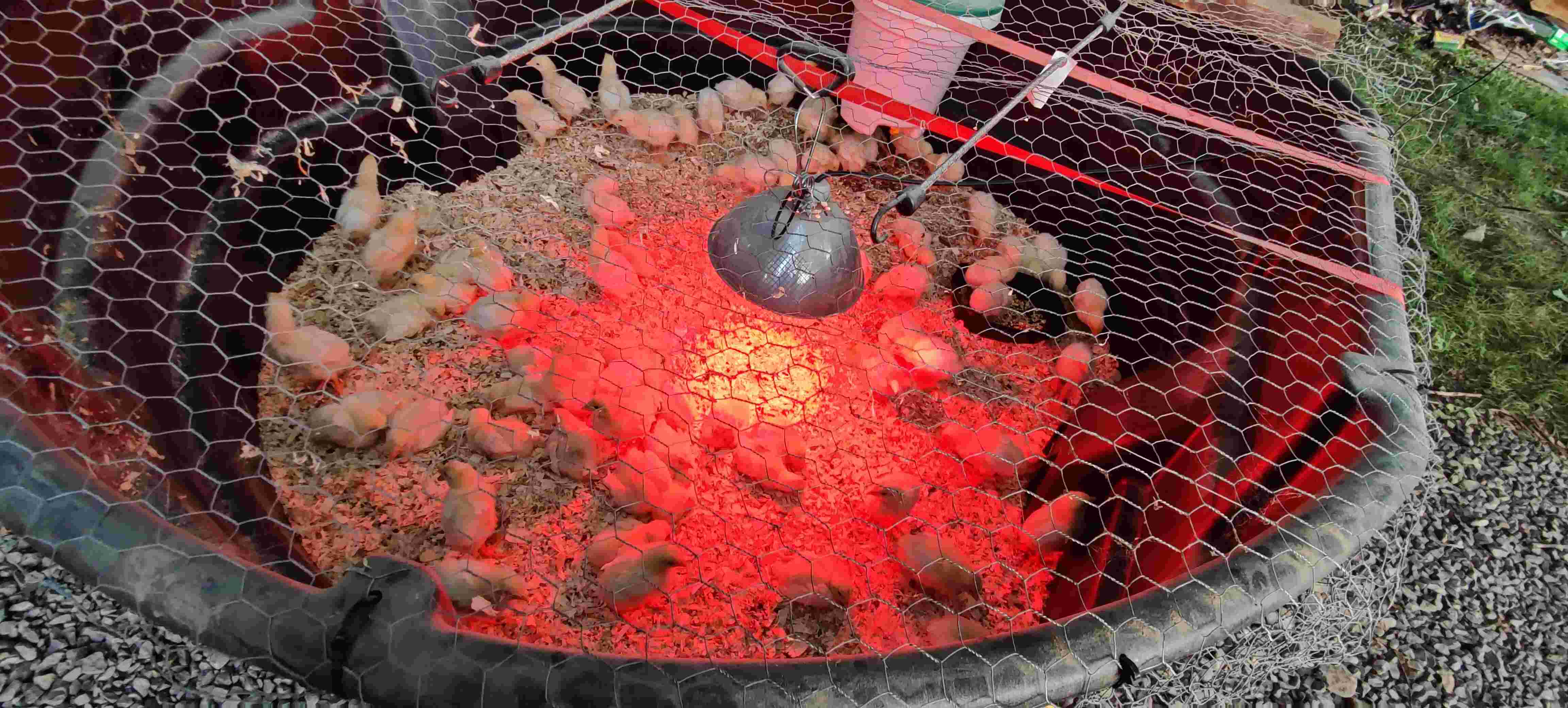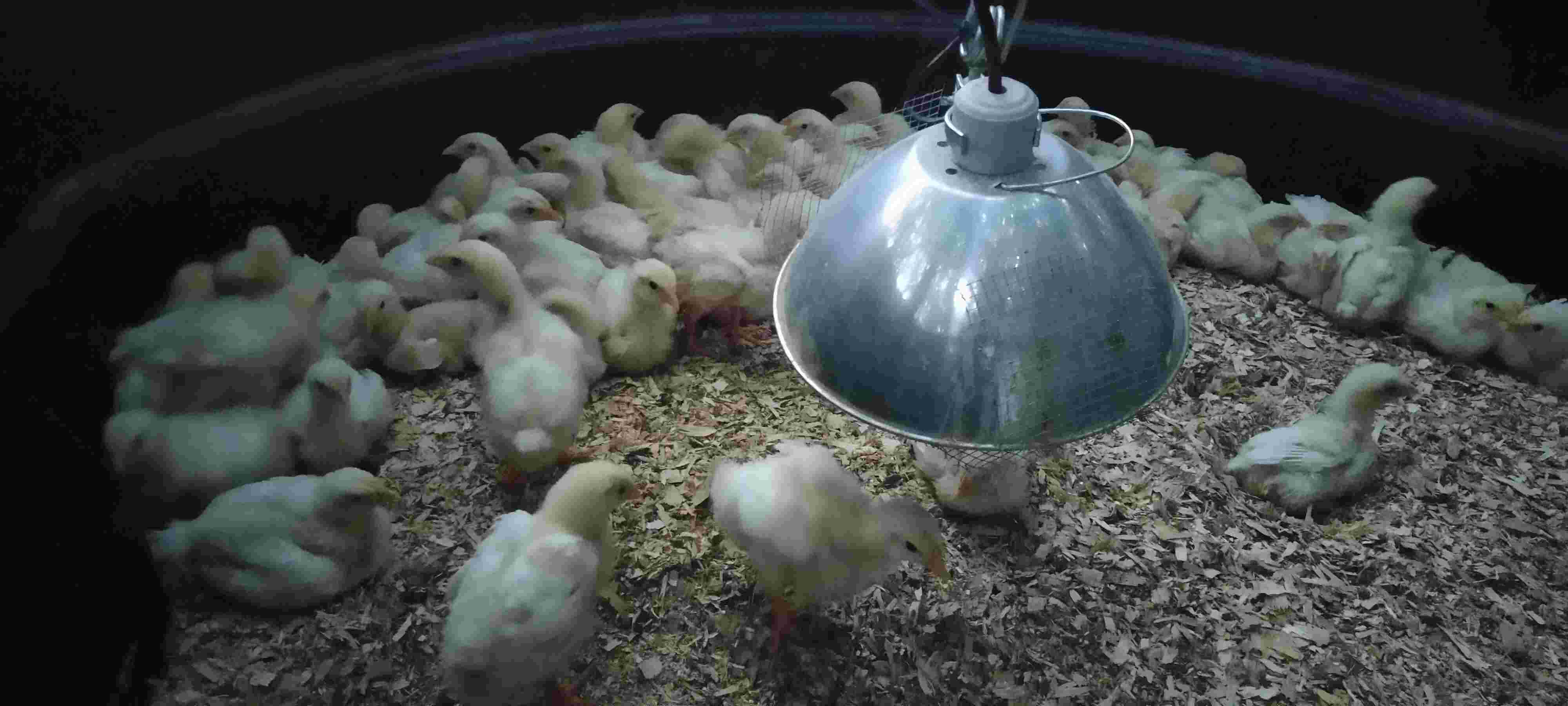 COMMENTS: RAINY DAY. CHICKS ARE HEALTHY AND DRY UNDER BROODER ROOF. ROTISSERIE CHICKEN TRAYS WORK GOOD AS FEEDERS, WITH THE LID SET UPSIDE DOWN ON TOP OF THE FEED IN THE BOTTOM TRAY.