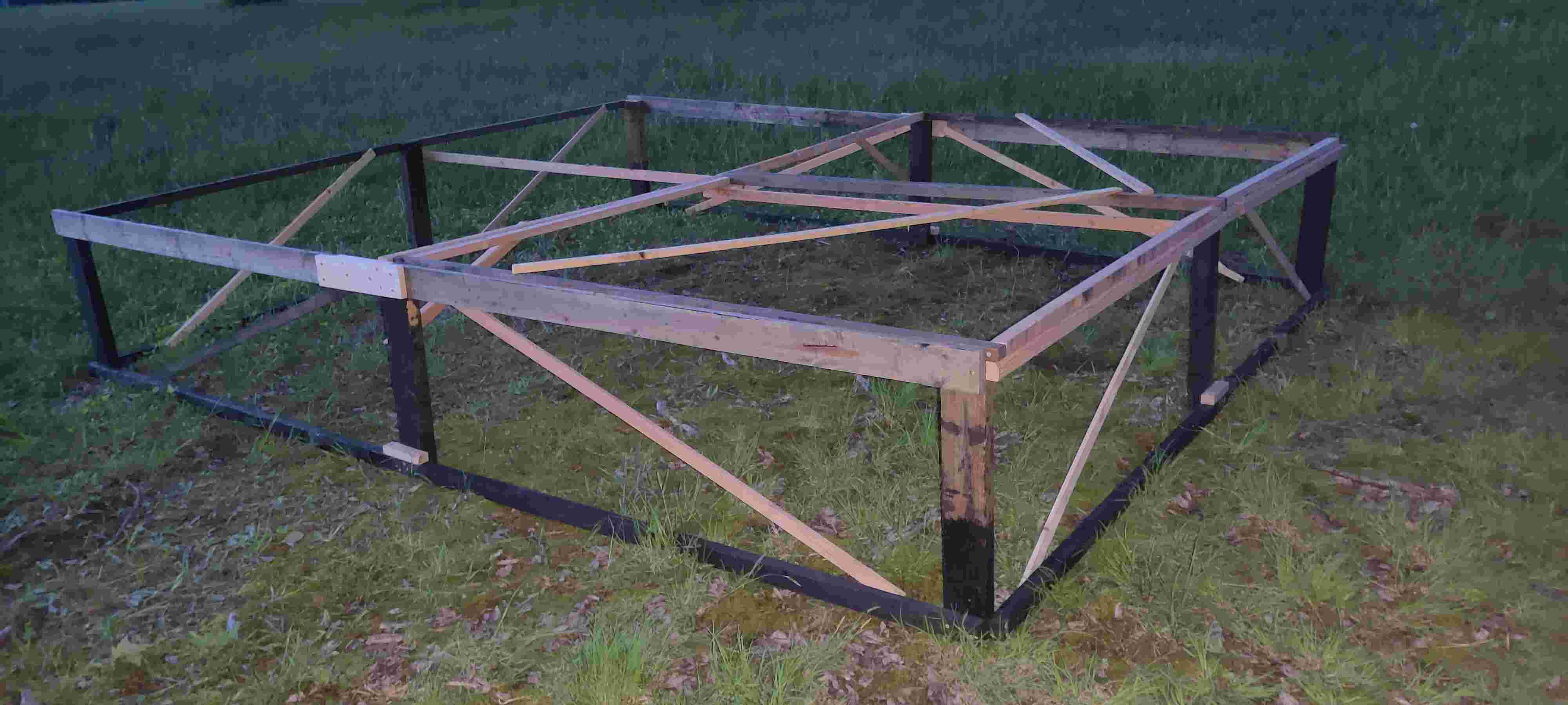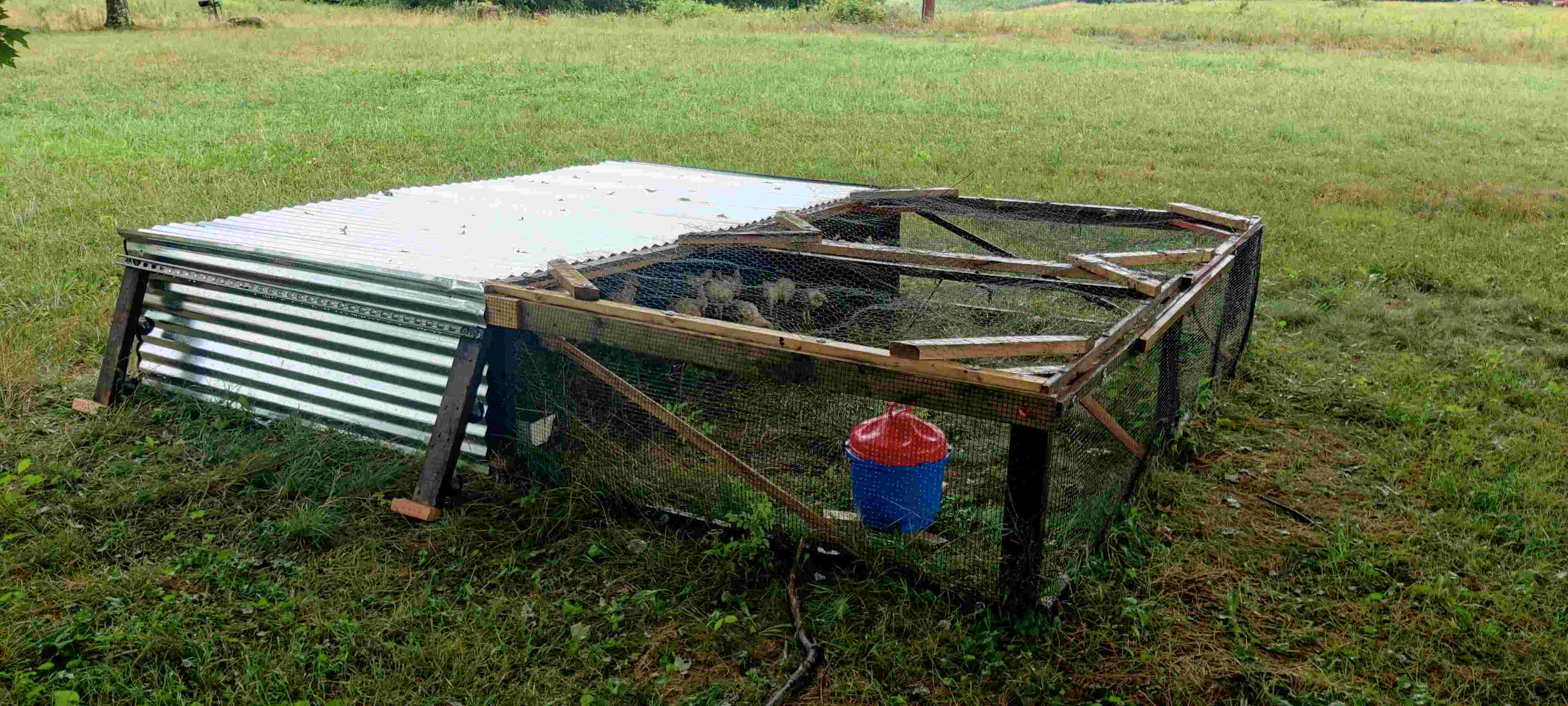 COMMENTS: I BUILT TWO PENS. ONE WAS MADE FROM HEMLOCK WOOD. ONE WAS MADE FROM PINE. I PREFER THE HEMLOCK BECAUSE A 2X4" IS ACTUALLY 2X4", MAKING IT BETTER TO SPLIT. I DECIDED TO BAIL ON THE PINE WOOD PEN AND DISASSEMBLE IT THAT DAY BECAUSE IT WAS CRACKING AND BREAKING AS I TRIED TO MOVE IT WITH THE CUSTOM DOLLY I MADE. I MADE THE MISTAKE OF SPLICING SHORTER RECLAIMED PIECES OF WOOD TOGETHER, THEY DIDN'T HOLD UP TO CRACKING AS WELL. NEXT TIME, I MUST BUY THE FULL 12FT AND 10FT LENGTH BOARDS TO KEEP THE PEN STURDY WHILE MOVING. THE WOOD PIECES LIST FOR ONE PEN ARE: 6 PIECES OF 2X2X2' HEMLOCK. 8 PIECES OF 2X2X12'.10 PIECES OF 2X2X10'. 8 PIECES OF 1X2X3'. 1.25" DECK SCREWS HEX BIT. 10 PIECES 8X~2FT GALVANIZED CORRUGATED ROOFING. 1.5" METAL-WOOD ROOFING SCREWS. 25' OF 2FT TALL 1/2" HARDWARE CLOTH. WASHERS. 25FT OF 5FT TALL CHICKEN WIRE 1". tHEE DOLLY FOR THE CHICKEN PEN TO MOVE IT WAS NOT VERY EFFECTIVE, SO IMM LEAVING OUT THE LUMBER I USED TO MAKE THE DOLLY. I USED A SMALL CAN OF BLACK FLEX SEAL AND DILUTED IT WITH HALF GALLON OF PAINT THINNER TO PAINT THE WOOD. IT PROVIDED PROTECTION FROM THE POOP AND WATER THROUGH THE SEASON EVEN THROUGH IT WAS A THIN LAYER OF FLEX SEAL PAINT.